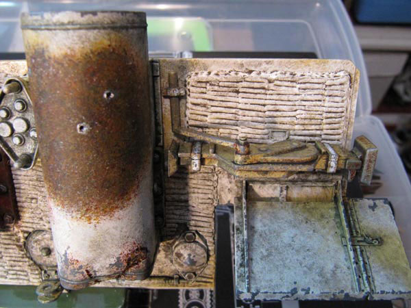 After, I painted the stacks themselves, with the large cast covers around them. These are different as the effect here is blistered paint and metal, not the addition of rust, as on the covers, so they look quite different.