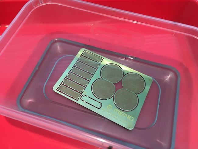 If you intend to try this, I’d recommend caution and suggest soaking an unused part of your etched fret (I used a piece of the frame) in the burnishing fluid first to see what effect it has on the metal. This will give an idea of how long to leave the photo-etched parts in the fluid to avoid damaging them.