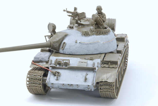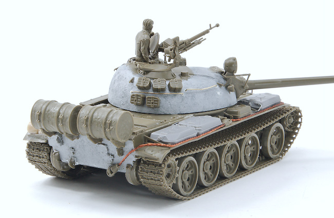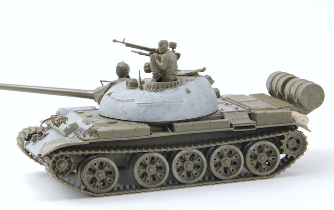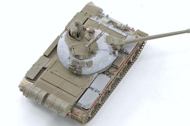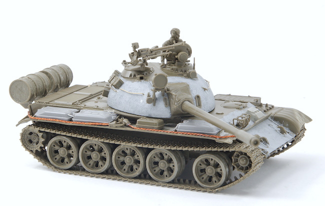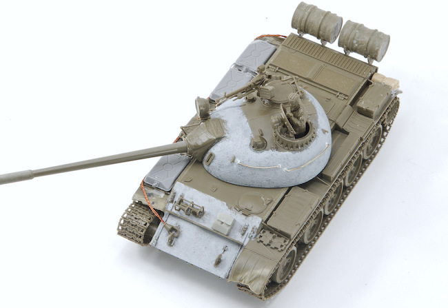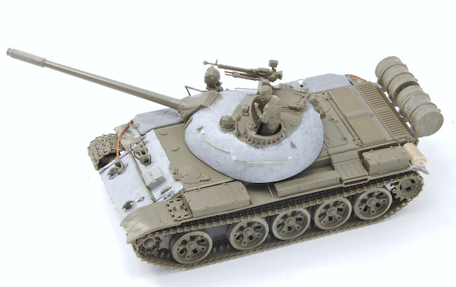 I added some armour texture with Tamiya grey putty mixed with MEK and stippled on with an old brush. I had the Tetra models PE but I am just not good with it. When I saw what was there I decided it wasn’t worth the effort. I did add the MP Originals (set No 48017) 1:48 T-55 Fuel Tanks w/Pipes. These are a cheap in worthwhile improvement over the kit parts.