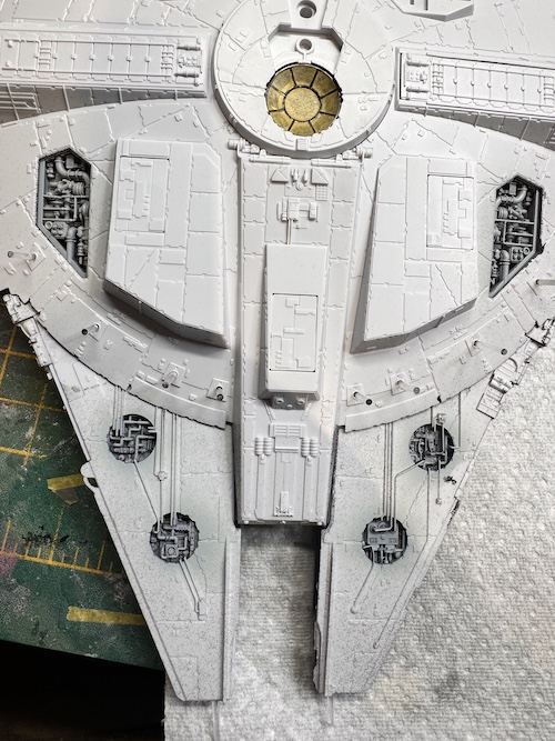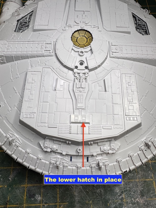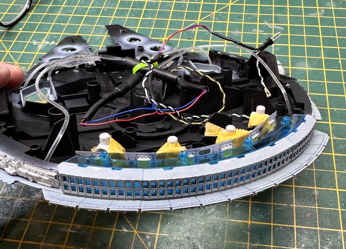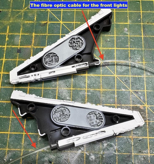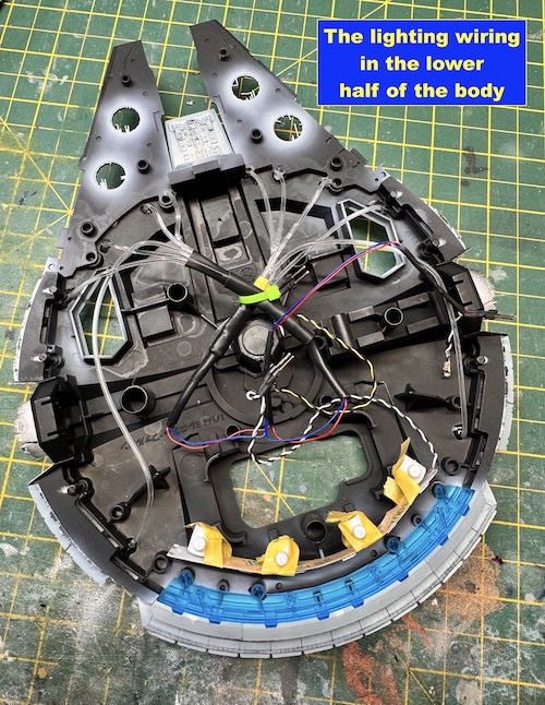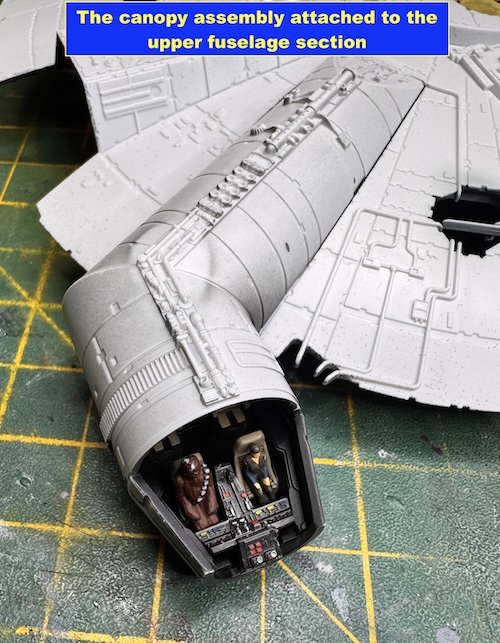 The cockpit was also painted up and the further fibre optic cabling added to light it up. The assembled cockpit was then added to the upper main section.