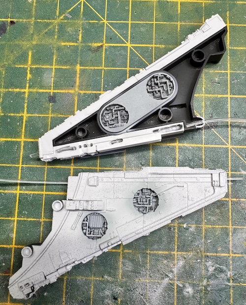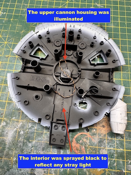 The interior of the upper and lower main sections was painted matt black to reduce / eliminate any light bleed through. The lighting for the engines and the upper and lower gun turrets could then be added. Don’t forget to glue in the inserts to stop any chance of them accidentally being pushed in and out of position. Fibre optic cabling was also routed from the LEDs to the holes that had been drilled out in the lower fuselage fort the landing lights.
