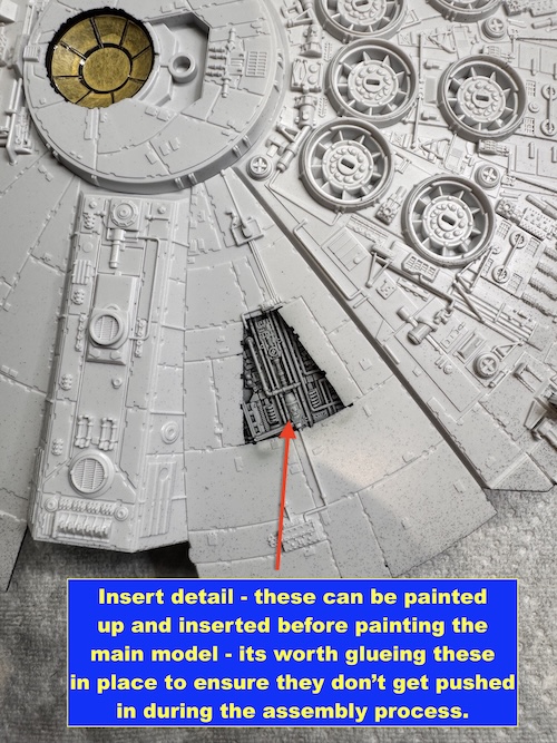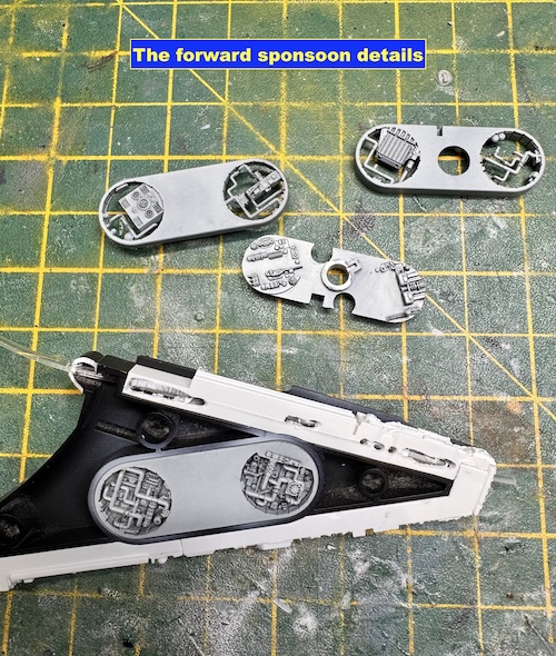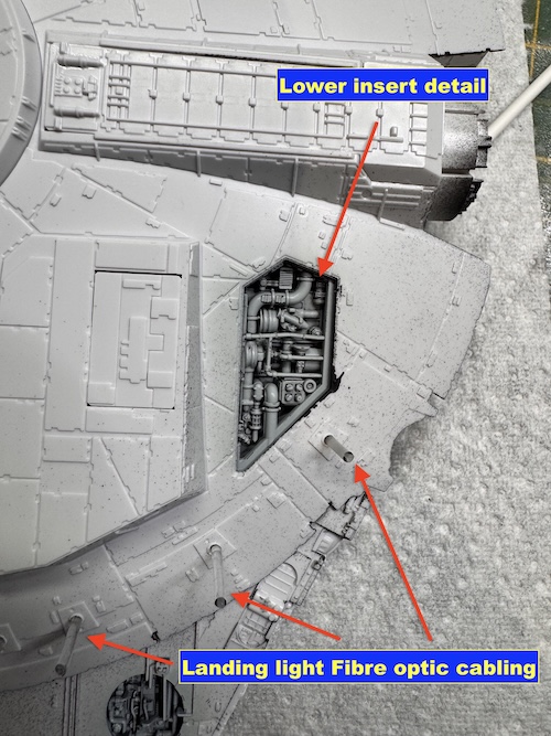 The first job is to paint up the inserts and then I would recommend that you glue them into the forward sponsons and the upper and lower main sections. I opted to do some ‘alterations’ to the lighting kit and light up some extra areas such as the lights in the forward sponsons and the landing lights. To do this I used fibre optic cable that was rooted through to the forward sponsons to the light exit points.