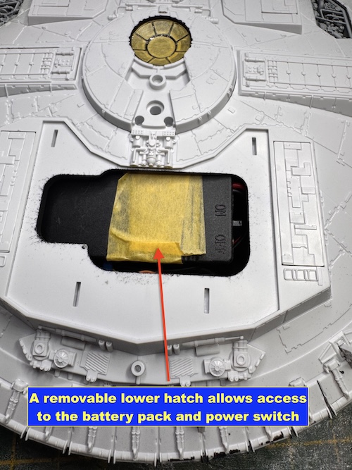 The lighting system is powered by a CR2032 battery that is housed in a battery box with the on/off switch. This battery is accessed through a removable access panel on the rear of the lower section of the model.