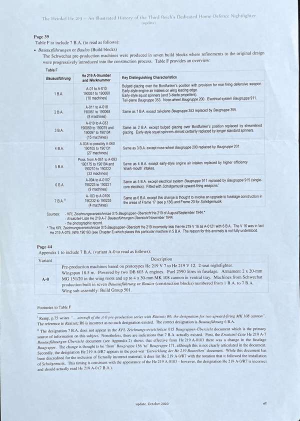 “It has been updated to include a seventh build block (Bauausfuhrung, 7 B.A.). It was not possible to include this in the book, but this was very much a ‘grey area’ at the time of publication. The attached supplement gives details of the changes which, as you’ll see, affect only the last 13 A-0 pre-production machines from Schwechat production.” Ron Ferguson, Author