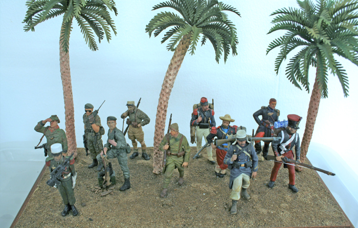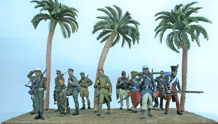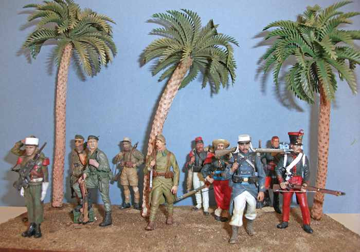 In thinking how best to represent the history of the Legion, I chose to put together a collection of 54mm scale figures in uniforms spanning the period from its formation to current times. The figures were set against a generic background designed to accept figures which would have fought in lands as diverse as North Africa to the Crimea. The use of palm trees in the diorama was to suggest the strong connection of the Legion with Africa.