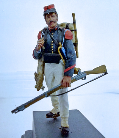 The figure represents a Legionnaire in the Russian Steppes in the Summer. He wears the veste (short tunic) which was the common form of undress uniform. The Airfix 95th rifleman body was used, mated to the legs of the Napoleonic French Grenadier Guards. The cap was scratch-built from modelling putty. Historex accessories were used.