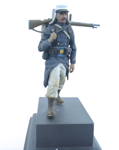 The figure is a stock figure from ——–. The uniform, highly impractical, shows the flamboyant influence of the French king. Note the replacement of the shako with a more practical local sombrero.