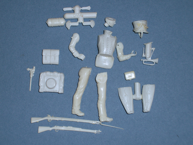 The figure was a conversion using the 95th rifleman body with the three rows of buttons trimmed off to leave a single row on the jacket. The short coat tails were removed and replaced with long coat tails from Historex. Airfix parts from the French line infantry and Guards kits provided the head, arms, shako, cartridge pouch, frogged bayonet and musket. The cowhide backpack came from Historex.