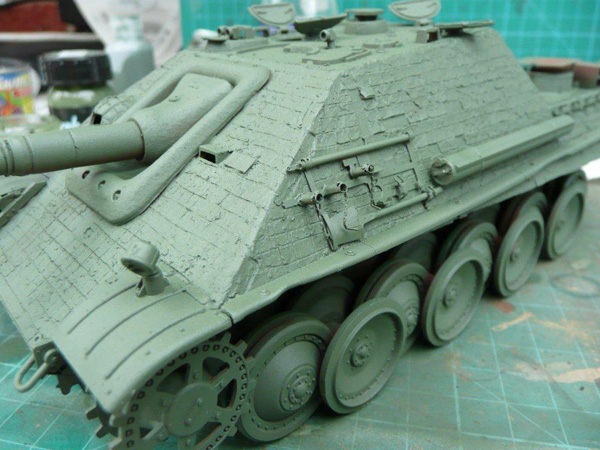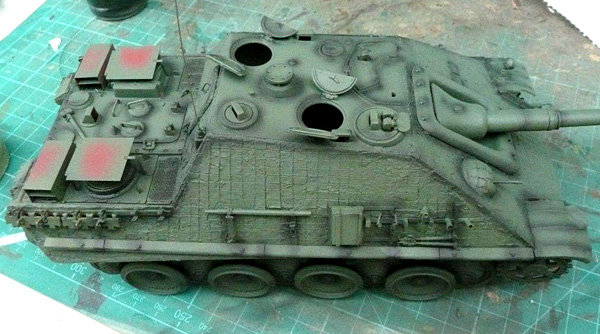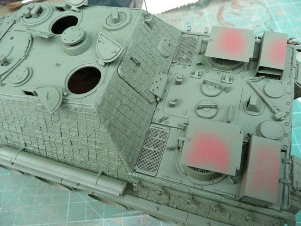 Next I mixed some black into this colour and sprayed all around the details and panels.