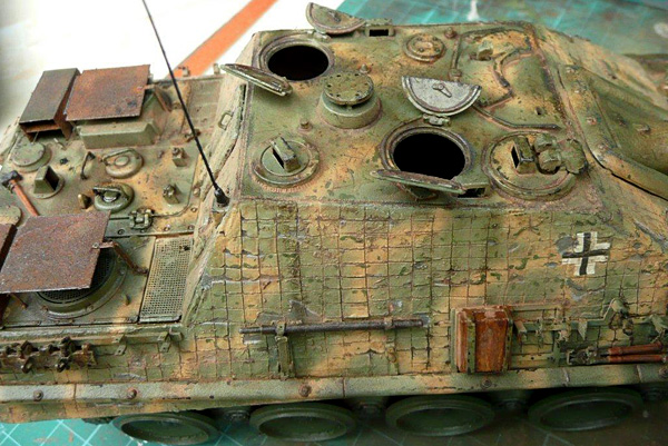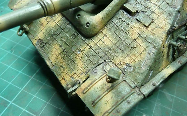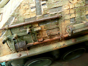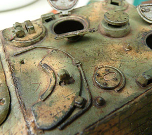 More pigments were diluted with thinners to a very weak mixture and was flowed around details on the tank. I varied the shades to give a realistic appearance. I also used a graphite pencil at this stage and rubbed it on areas of high wear.