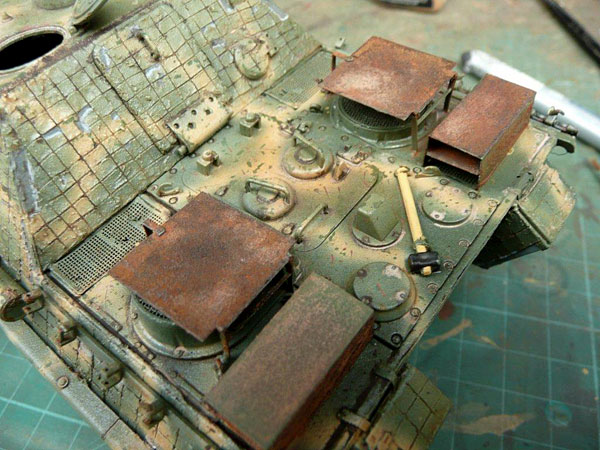 Pigment powders were now used to represent small rusty areas. This done by mixing pigments with a small amount of thinners and painting into areas of wear and damage.