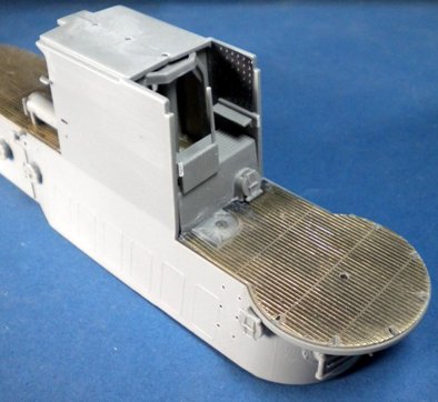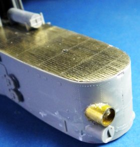 My next job was on the stern. The kit comes with a very good representation of the fixed cast prop guards. In reality these created additional noise that would make detection by enemy sonar much easier so they were removed at the start of the war. I cut off, filled and sanded the raised areas on the hull where the guard would be fixed as later I would be using the temporary steel prop guards used in port and beautifully supplied by White Ensign Models.