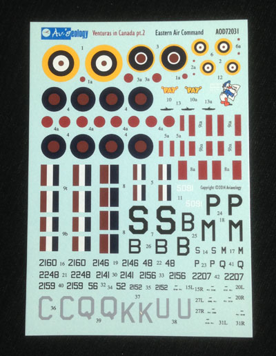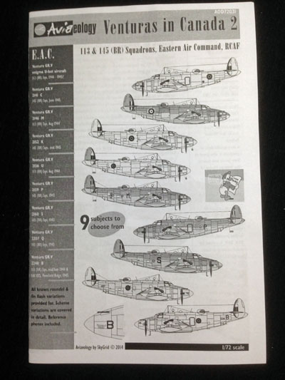 This release is an impressive decal sheet for modellers featuring Lockheed Ventura aircraft that flew in Canada. We built the very good Revell 1:48 kit here and what a good job Julian S made of it too. This sheet is for the smaller 1:72 scale but check the Aviaeology website for availability in different scales. I’m aware of the Ark Models 1:72 kit that’s available at the time of writing although you may find other kits too that will be good for using with this new decal sheet. But how good would it be to have an alternative schemes or schemes available to that supplied in the kit – well now you have – multiple options in fact! Using your chosen 1:72 model as a base will provide the perfect complement to the markings on offer here – fit shouldn’t present any issues at all. The quality looks to be excellent with good solid whites in the roundels, codes and stencils where appropriate and opaque colours for the remaining decals. The carrier film looks to be very thin and minimal excess on view. Detail is very high quality with everything in perfect register – great! Accuracy looks spot on to my eye and you get some very interesting schemes too covering no less than 9 aircraft. You can see for yourself the specific aircraft featured; all very varied and interesting subjects and, as I say, just click the link above to take you to the decals and how to order them at Aviaeology.