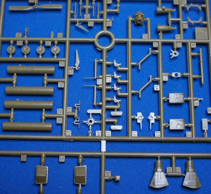 The plastic on the sprues is nice and crisp and moulded in an olive green colour. There is minimal flash on the parts and the surface detailing is recessed, with some raised panels where required as on the real thing.