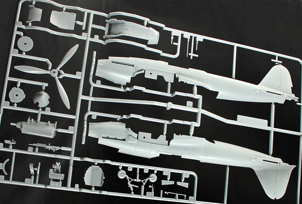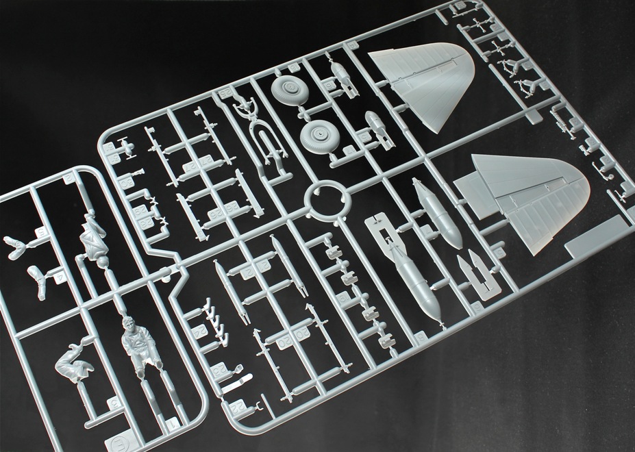 There are two sprues that hold the tailplanes, bombs rockets and exhausts. The bombs will look good painted up and weathered and the bomb releases are very delicately detailed. The exhausts will need hollowing out but this is no big deal. A sprue above also contains pilot and gunner figures (its twin does not!) The gunner’s arms and legs are positionable.