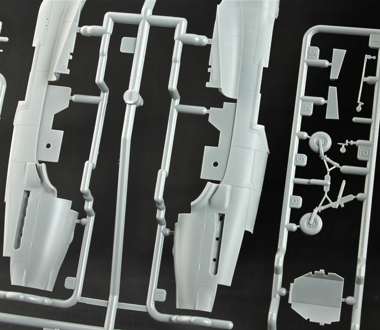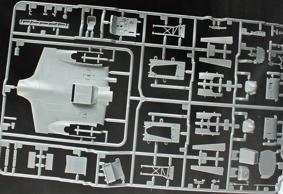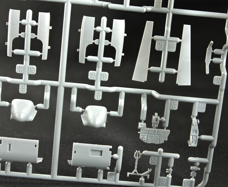 One sprue has the parts for the main undercarriage and cockpit and the large part for the underside of the air frame. The cockpit pieces are more than adequate for an out of the box build but they would have to be replaced with aftermarket to get any further detail into the office.