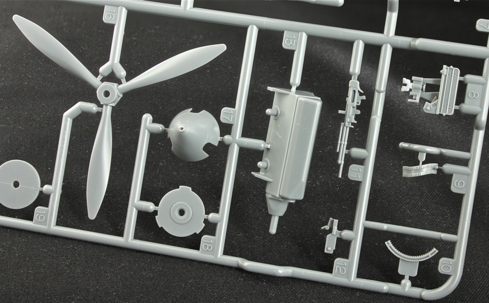 There is a minutely detailed machine gun on one of the sprues with the mounting and ammo supply. The engine is not on display in the finished kit so is supplied as a block just to attach the prop to.