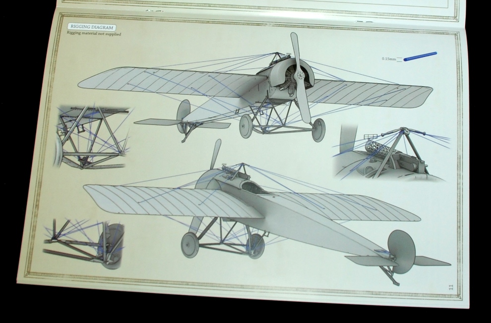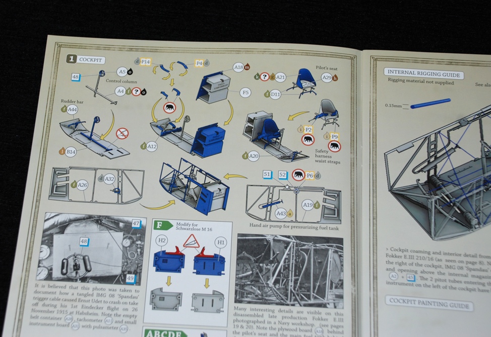 The Wingnut Wings (WW) instruction booklet is one of the big highlights with any WW kit and this one is no exception – quite superb. Full colour illustration and diagrams give very clear instructions as to where everything goes. Good use is made of different colours to make identification and placement of all parts – and rigging later in the book, straightforward. There’s quite a bit of rigging to add to the Eindecker but the diagram makes locating each wire very clear.