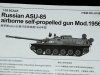 The SU-85/ASU-85 is based on the PT-76 tank chassis, but without the amphibious capabilities and fitted with a new engine. The vehicle has three compartments: the driver’s in front, the combat compartment in the center and the engine compartment at the rear. The armament consists of a D-70 (2A15) 85mm gun, derived from F.F. Petrov’s D-48. The L/67 ordnance has a total weight of 1,865 kg and an elevation range from -4.50° to +15°. Traverse is 15° either side. The D-70 fires the same ammunition as the D-48 (3BK-7 HEAT, BR-372 HVAP-T and OF-372 HE), the combat load is 45 rounds. The gun has an effective range of 1,150 m and a maximum range of 10 km. The coaxial machine gun is either the SGMT or the PKT with a combat load of 2,000 rounds. Both the main gun and the coaxial machine gun are aimed by means of the TShK-2-79 sight. For nighttime fire, the TPN1-79-11 sight is used, in combination with the IR searchlight L-2. Indirect fire is conducted with the help of the S-71-79 and PG-1 sights. Furthermore, the commander is provided with observation devices TNPK-20 (day) and TKN-1T (night). All ASU-85s were provided with an R-113 radio and the R-120 intercom system. In the early 1970s, some vehicles were fitted with a DShK-M 12.7mm heavy machine gun with 600 rounds. These vehicles had a reduced combat load of 39 main gun rounds and received the NATO designator ASU-85 M1974. The original designation was SU-85M or ASU-85M. The ASU-85 could also be equipped with smoke generators BDSh-5.