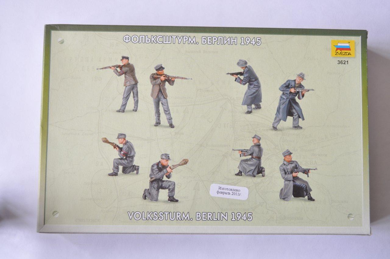 The youngest figure holds a Panzerfaust with the three other older guys holding a rifle, an MP40 and what appears to be a 7.92mm Volkssturmgewehr 1-5 held by the last person with overcoat and trilby hat.