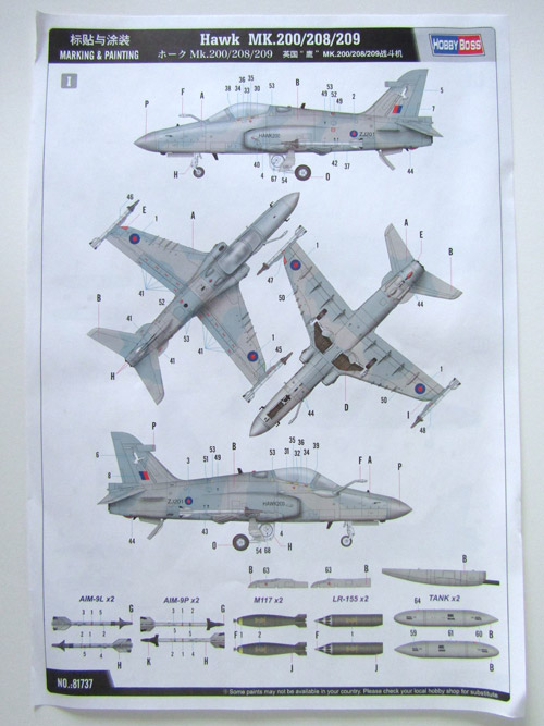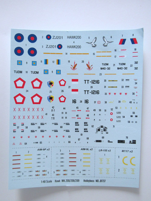 A separate full colour double sided A4 sheet contains colour callouts and decal placement guide for the three options available, one Malaysian Mk208, one Indonesian Mk209 and interestingly one of the pre-production demonstrator airframes ZJ201.