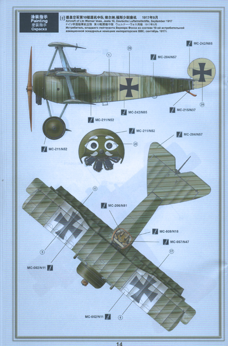 The colour charts in the kit’s instructions suggest that the streaks on all the horizontal surfaces were at about 45 degrees to the line of flight as shown on one of the pages relating to Voss’ triplane below.