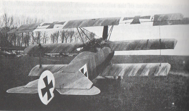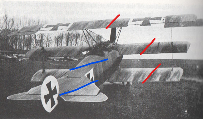 However, a photo that I found of a triplane on the internet suggests that the angle at which the streaked camouflage was applied on the wings was quite different from that on the top of the fuselage and the horizontal tail surfaces.