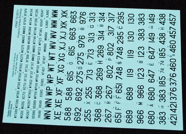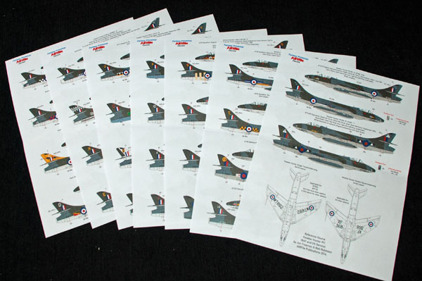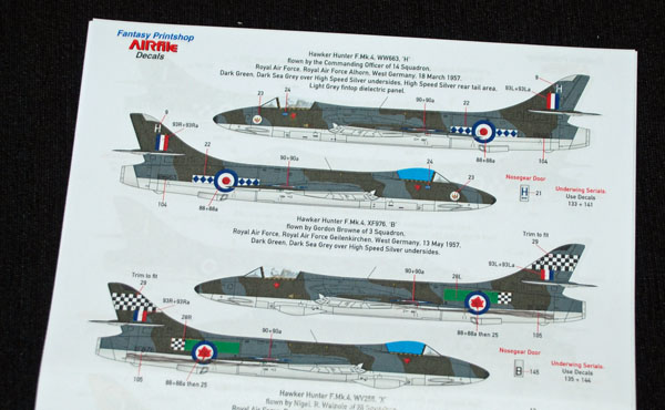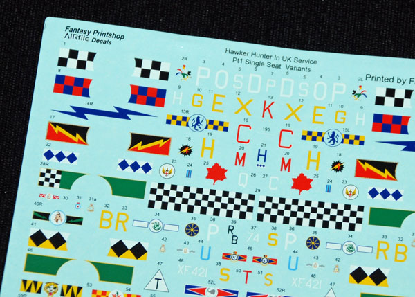 Back to this package, for that’s exactly what you get here – decals for no less than 32 different Hawker Hunters in 1:72 and all are single-seaters. There is a complimentary set (also reviewed in Here Now) covering twin-seat Hunters. Quality is very good as anyone who has used decals from Fantasy Printshop before will know.