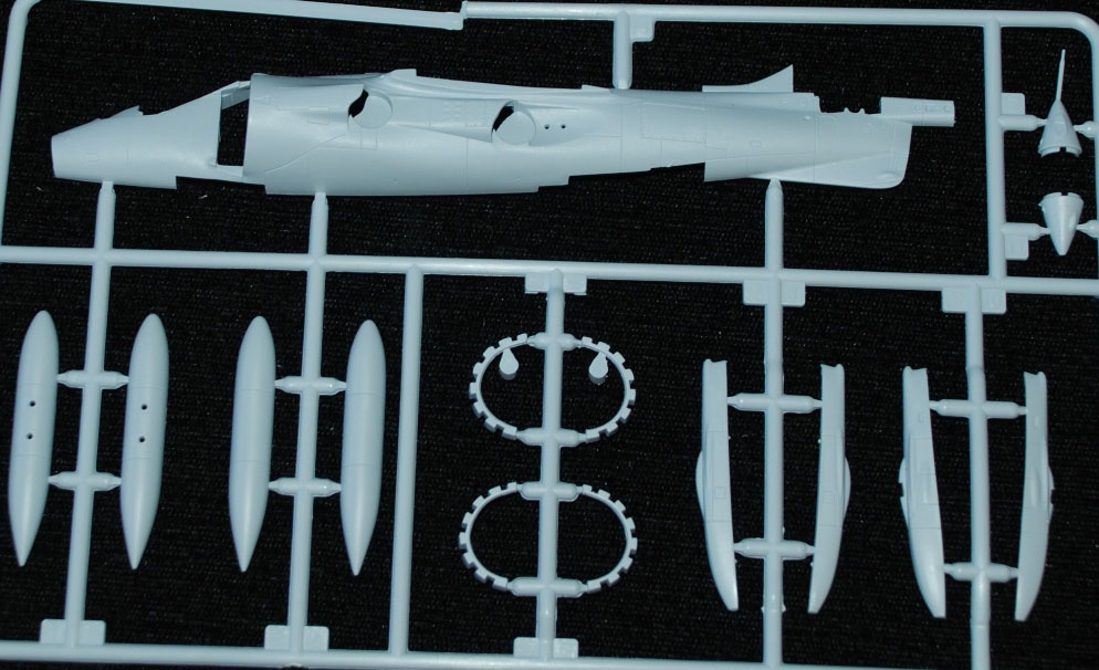The intake doors come open or closed for in-flight and ‘parked’ fit but one of the nicest moulded parts is the Pegasus engine fan blade insert – very finely moulded. You get some nice stores with this model like the Matra rocket pods and twin 30mm Aden gun pods beneath the fuselage.