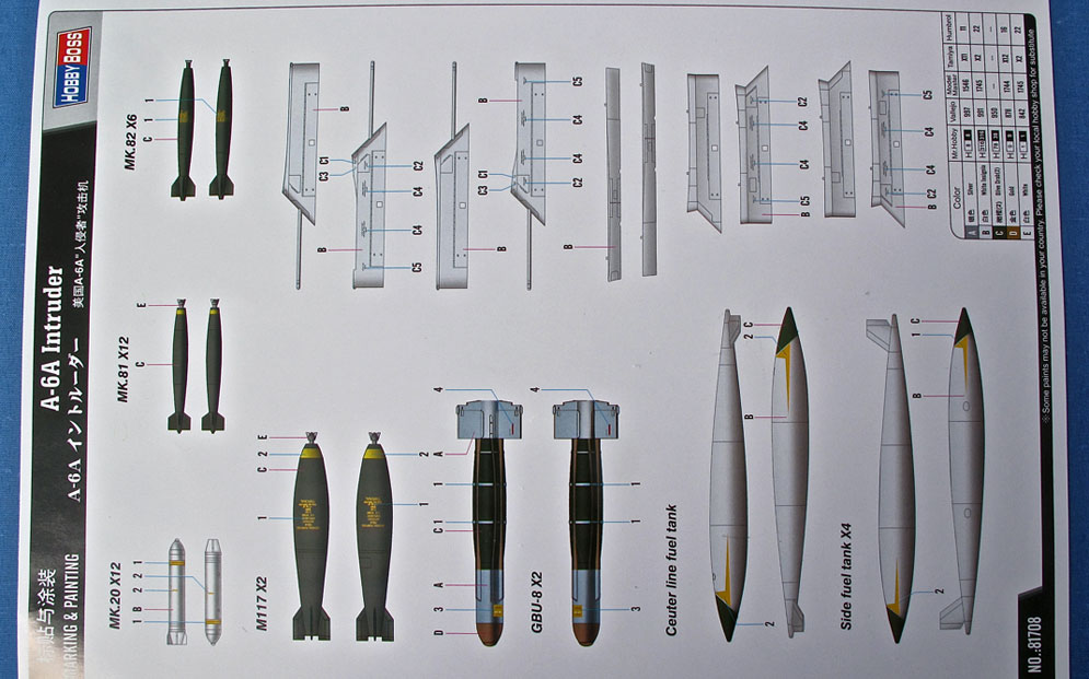 Also included are colour inserts for the painting and decal positions. One is single-sided and covers the stores. The other is double-sided for the two scheme options. Colour callouts are for Mr Hobby, Vallejo, Model Master, Tamiya and Humbrol paints.