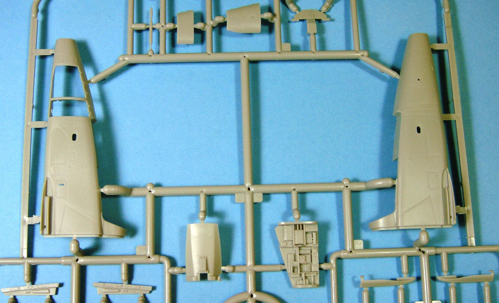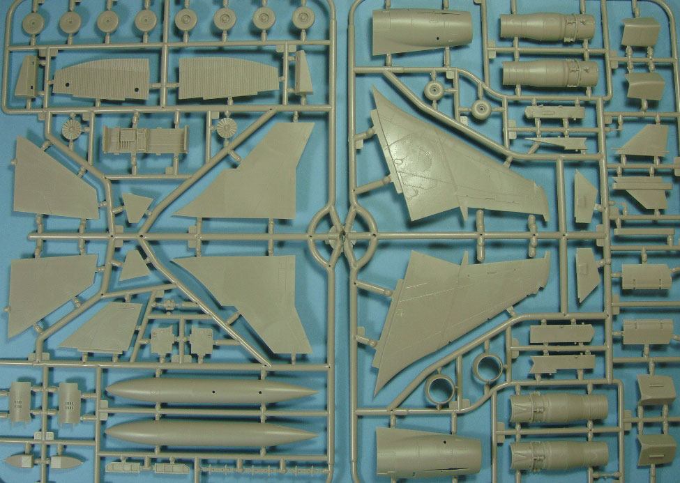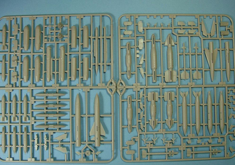 The parts are individually numbered and are located on 7 letter coded sprues D thru J. Assuming the two larger individual fuselage halves are A and B, sprue C seems to be missed and D is the next in line. The sprues are not logically arranged and don’t group common parts together, apart from the weapons on E & F.