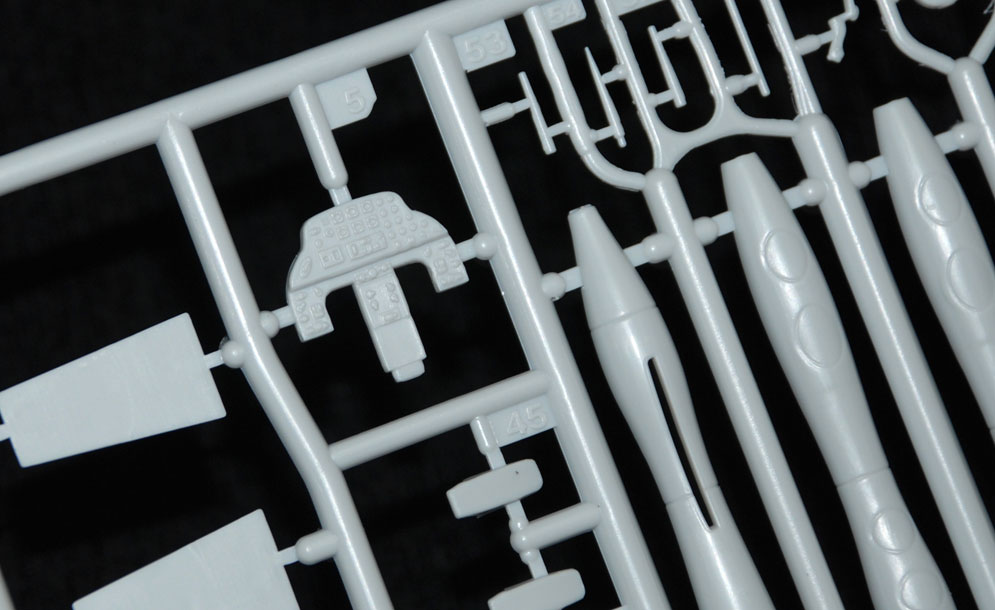 Inside, the light grey sprues offer parts that have very little excess flash plastic and well moulded items – check out the instrument panel and wheel hubs for example.