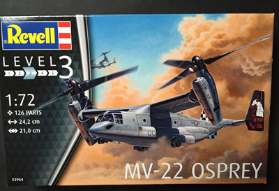 The Revell box artwork is usually impressive enough and that’s the case here – an image of an V-22 (rather than an MV-22 as advertised) getting airborne in the desert.
