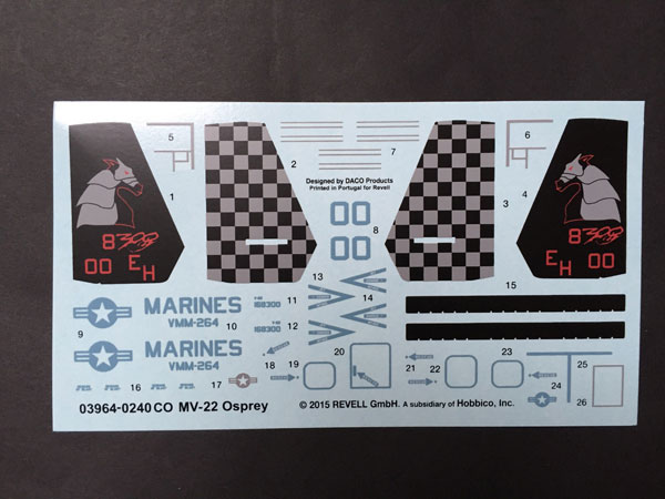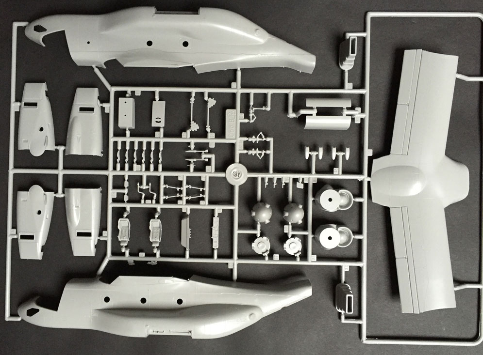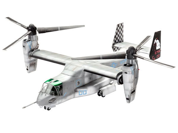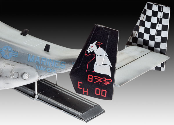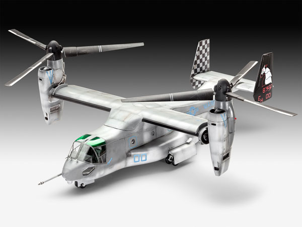 This isn’t a new Revell kit, being first released some years ago (apparently 1989 by Italeri and later in 1996 by Revell) but with new decals this time. It is pretty well detailed, has inte-rior details – including the prominent Tiltrotor double engine assemblies and raised interior cockpit detailing. Raised panel lines are evident but these are very restrained and the shape overall looks good.