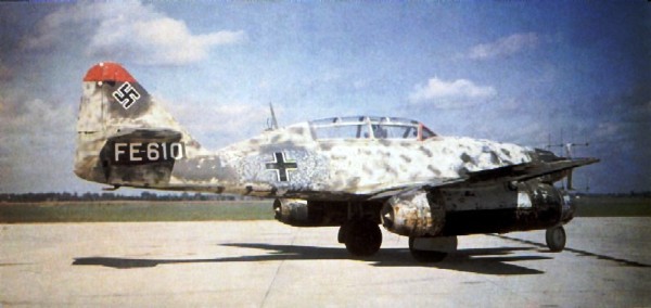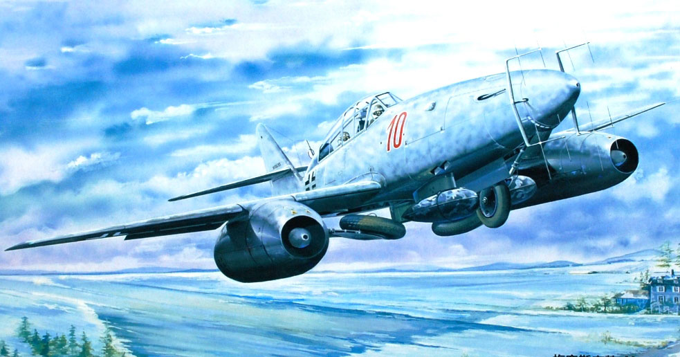The Messerschmitt Me 262 Schwalbe (English: “Swallow”) was the world’s first operational jet-powered fighter aircraft. Design work started before World War II began, but engine problems prevented the aircraft from attaining operational status with the Luftwaffe until mid-1944. Compared with Allied fighters of its day, including the British jet-powered Gloster Meteor, it was much faster and better armed. One of the most advanced aviation designs in operational use during World War II, the Me 262 was used in a variety of roles, including light bomber, reconnaissance and even experimental night fighter versions. Several two-seat trainer variants of the Me 262, the Me 262 B-1a, had been adapted through the Umrüst-Bausatz 1 factory refit package as night fighters, complete with on-board FuG 218 Neptun high-VHF band radar, using Hirschgeweih (“stag’s antlers”) antennae with a set of shorter dipole elements than the Lichtenstein SN-2 had used, as the B-1a/U1 version. Serving with 10 Staffel, Nachtjagdgeschwader 11, near Berlin, these few aircraft (alongside several single-seat examples) accounted for most of the 13 Mosquitoes lost over Berlin in the first three months of 1945. However, actual intercepts were generally or entirely made using Wilde Sau methods, rather than AI radar-controlled interception. As the two-seat trainer was largely unavailable, many pilots made their first jet flight in a single-seater without an instructor.