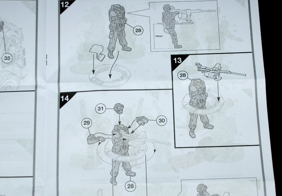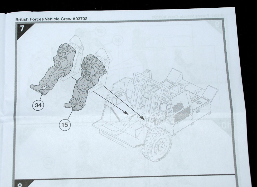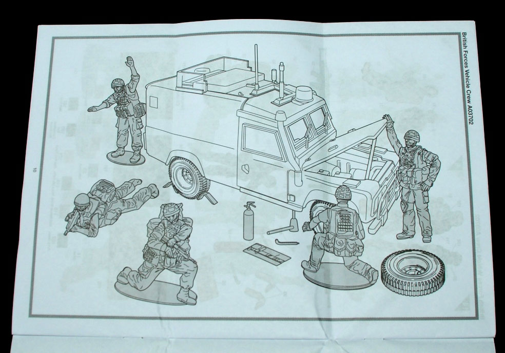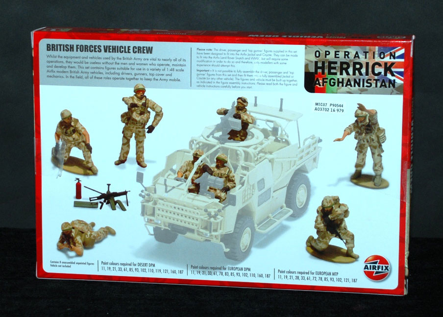 As Airfix points out: The Driver, Passenger and ‘Top Gunner’ figures supplied in this set have been designed to fit the Airfix Jackal and Coyote. They can be made to fit into the Airfix Snatch Land Rover and WMIK, but they will require some modification in order to do so, therefore only modellers with some experience should attempt this.