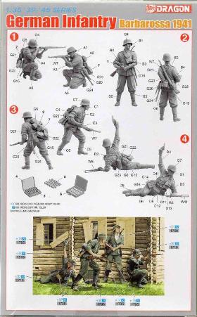 This figure kit depicts four infantry figures during the Barbarossa period of operations, one kneeling taking aim, one standing cocking rifle, one standing with grenade and the last laying with arm outstretched firing a very pistol whilst looking rearward, all being in “action” poses. The contents consist of four sprues cast in light grey plastic the largest having the figures and some equipment, the next largest sprue has personal equipment including helmets, bread bags, gas mask canisters, ammo pouches, bayonets , shelter quarters, gas cape pouches, pistols and pistol holsters with added items of grenades and mess tins. The next in size is a set of weapons of 1st generation consisting of three Mp40, four Kar98K rifles, an MG34, MG42, Gewehr 43 and a StG 44. Also included on this sprue are ammo clips, a folding stock for one MP40 and three Ammo drums for the MG’s. The last is a small sprue with four entrenching tools.