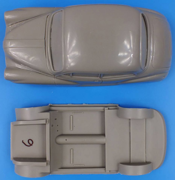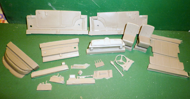 The interior consists of the floorpan, side door panels, dashboard and front and rear seats – even those tiny little dash switches are moulded as separate parts. The exterior door handles, hubcaps and bumpers are supplied as resin parts and will need to be chromed, either using Alclad2 lacquers or another product that gives a realistic chrome appearance.