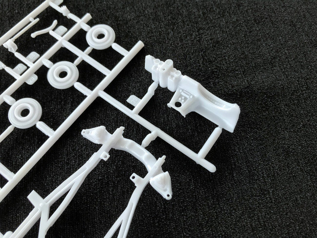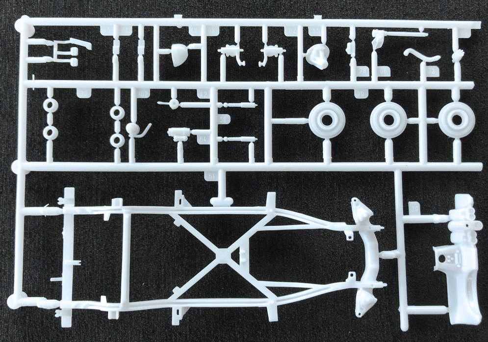 The kit is generally well moulded with the main chassis parts on white sprues. Taking the main components first, they are well tooled, fine recessed detail and adequate levels of design across the board – a decent engine is included, made up from plenty of well-formed parts. I’m not sure that I would go to the trouble of painting it as supplied given its location but you can make your own mind up about that. For me, I would like to preserve the shape of that Corvette styling.