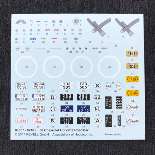 Good quality of offer here. Markings in register and colour looks good. What’s included really covers various number plates from different countries plus seat belts and logos as well as those instruments.