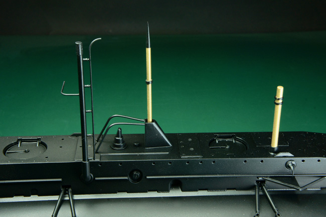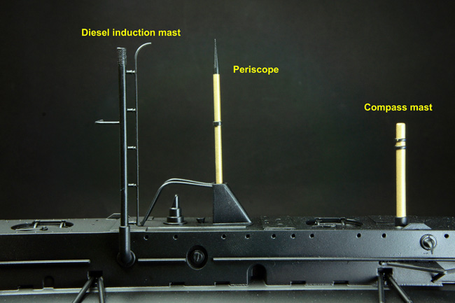The masts were added next and the kit has the option to have the periscope and compass mast extended or retracted and the induction mast folded down. I went for everything up.
