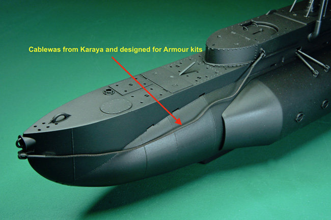 Reference pictures showed a cable between the bow and front of the coaming. I managed to source this from Hannants in the form of an armour tow cable from Karaya.