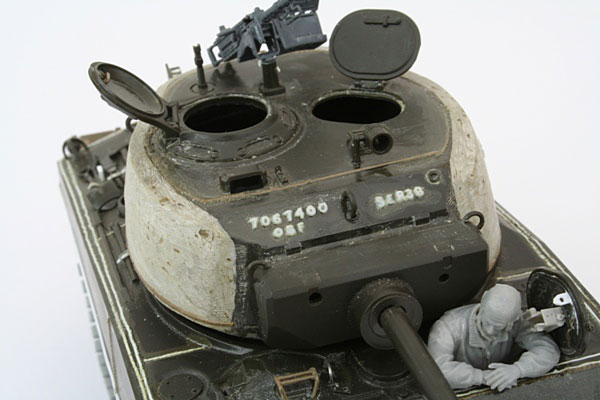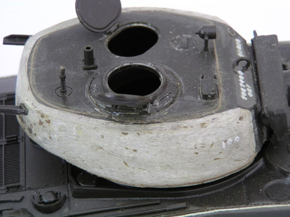 On the top of the turret the weld seam indicating the start of the turret wall was removed. Conveniently the armour of the turret should start at the edge of the existing turret. With a set of plans as a guide, the sides and back of the turret were reshaped with the putty. A new weld seam made from stretched sprue and textured with glue and a craft knife was added back at the edge of the built-out walls.