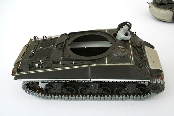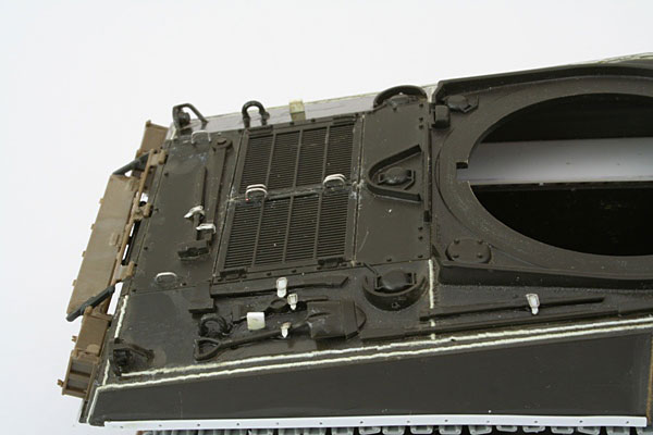 The sponsons on the kit are open underneath. Also the weld seams are recessed rather than being raised. These were corrected by filling the sponson floor with plastic card and adding new raised weld seams from plastic rod and sprue softened with glue and shaped with the blade of a scalpel.
