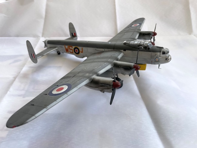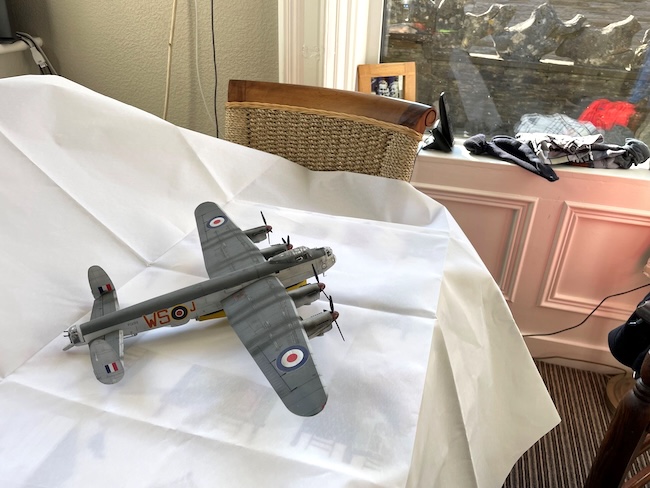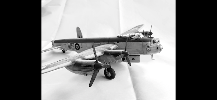 Here’s my 1/72 Lancaster, which is too big for my double A4 background, so I have bought a cheap and cheerful ‘drape’ studio background from a famous auction site for under a tenner. You will notice that its really, really creased! I’ve ignored that for the sake of getting on with the important stuff here, I hope you understand and it will make a real difference to iron your cloth, otherwise the creases will detract significantly from your finished model. Again, you see the underexposure produced by all that white, which I have corrected, then gone to a b&w end result.