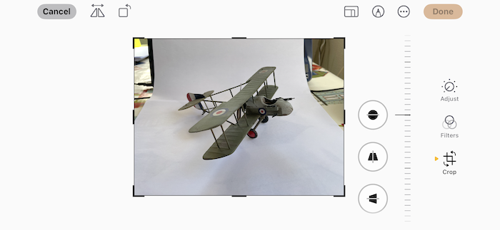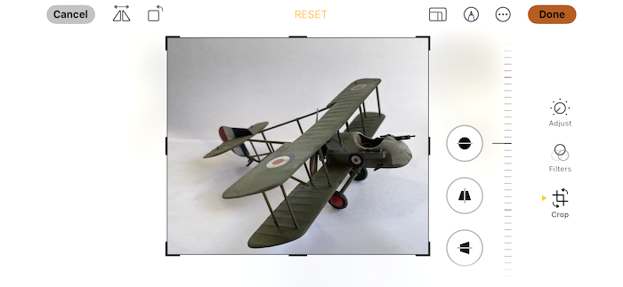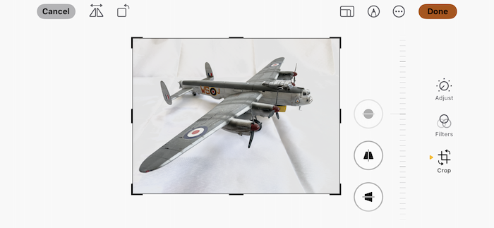 One of the simplest enhancements you can make to your phone shots is to ‘crop’ the shot. This means removing any unwanted area from around the edge of the subject proper. You sometimes need to do this, for instance, if the phone is not in the best position or at the right angle, or you want to take off some excess background off one or all of the sides of the picture. Also, most phone cameras are ‘wide angle’, that is they have a wide angle of view. So if you fill the screen with your (relatively) small model you have to get the lens really close to the subject, and this causes distortion. Just try it for yourself and you will quickly see what I mean. The perspective is startling! You can get round this by pulling back, and not filling the screen with the subject. This of course leaves a lot of spare space around the model, which is not desirable. Here is where cropping comes in again.