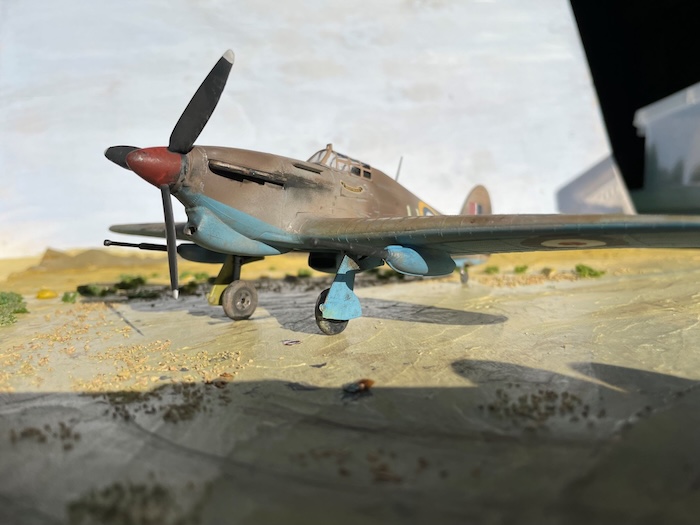 Using a desert diorama base this time, and a painted board ‘sky’ background, I explored another alternative to a kitchen table using a space just inside a garage door, on this occasion lit by strong sunlight. I know I warned against strong sunlight coming through a window, but on this occasion it just looked too good to ignore! And it worked just dandy. The harsh shadow in front of the Hurricane is from my head, by the way. But I got away with it.