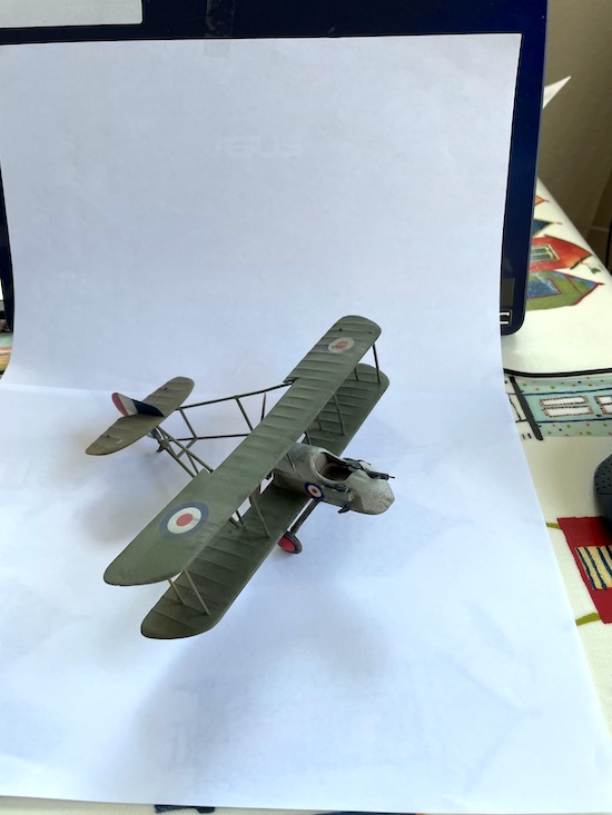 Photographing your model on anything but a plain, or diorama (more of that later) background distracts from seeing it shine in all its glory. And my suggestion for an easy way of producing a plain white background, for an easy example, is to get two ordinary sheets of white printer paper. I sellotaped one to the sloping back of my laptop, and placed the other on the kitchen table in front of it, thereby producing an A3 size background. There is a join, of course, where the two sheets meet, but this doesn’t intrude too much in the end result. If you want a bigger background, see my later tips on bought backgrounds.