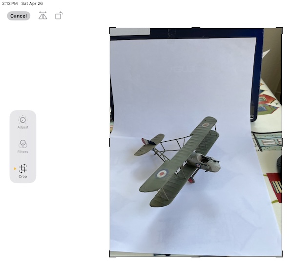 Looking at the central trio of icons under the picture, these appear once you click on the shot you want in ‘Photos’. Press the right hand one (three horizontal lines )and more icons will appear on either side of the picture. The ‘crop’ icon is on the bottom left. Click on it, and it puts a black line round the shot, then drag the corner tabs into the shot to crop off any unwanted image. It also allows you to correct any skewing of the shot by or in my language ‘wonkiness’ with the sliding scale on one side. The screen can vary from (in my case) iPhone to iPad, and of course on different brands of device….. but I hope my prompts get you close enough to working with your device.