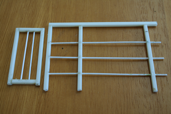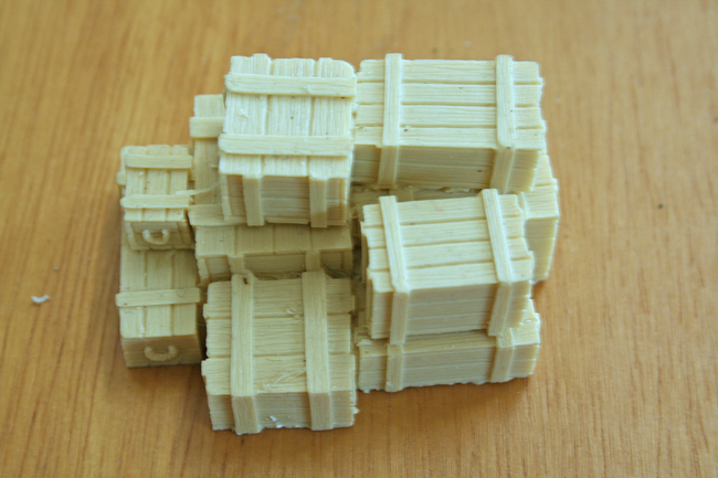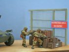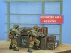 To give the impression of an enemy strongpoint, stored materials were represented by a stack of boxes taken from the spares box. In addition, a security fence was added to the base. Built from plastic rod and stock, wire mesh from a cooker splash guard was cut to fit and glued in place to represent the wire fence after the frame was painted.